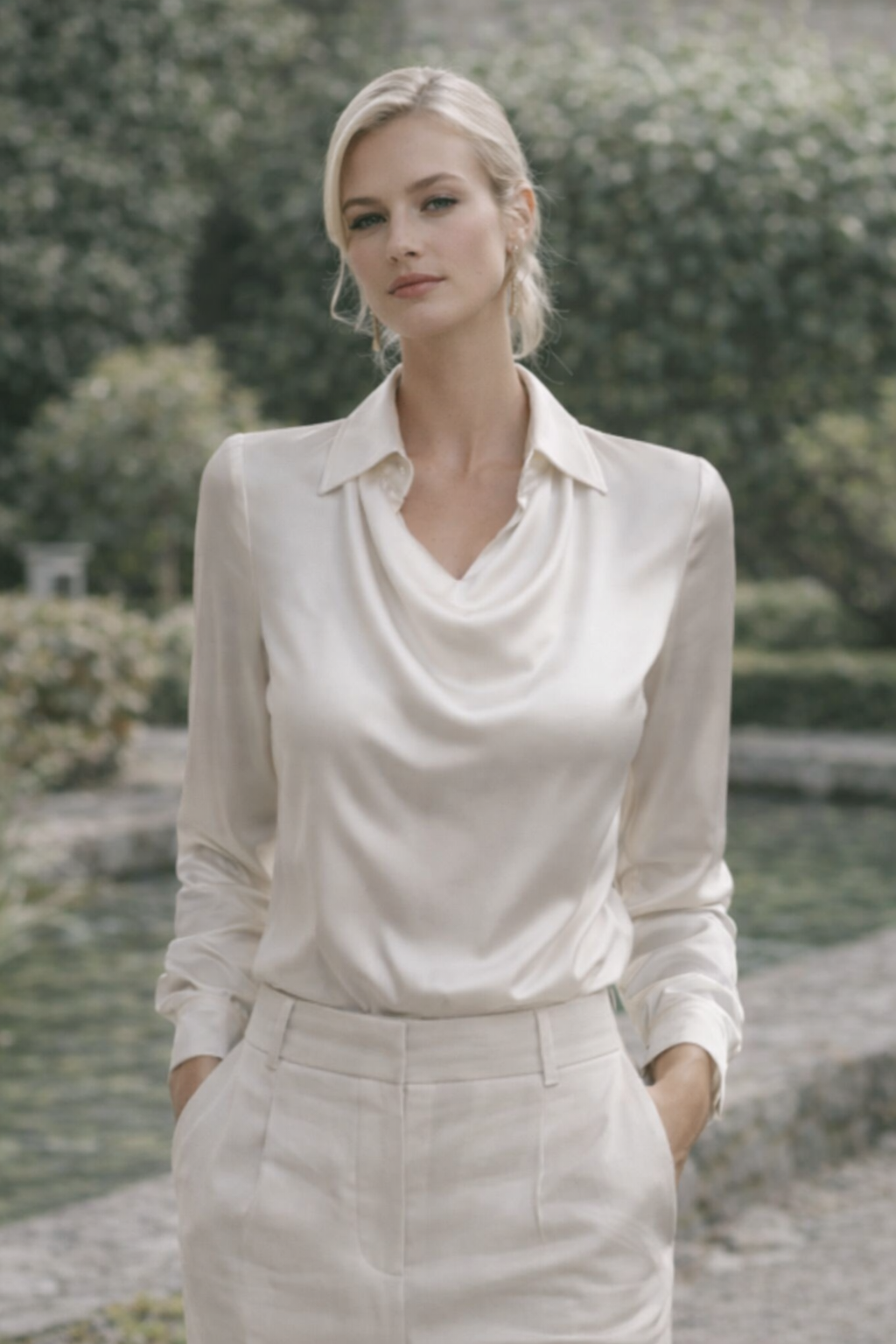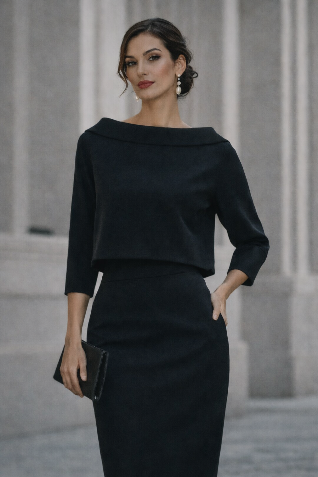 Ensemble avec blouse à col montant et manches cape et pantalon large fendu