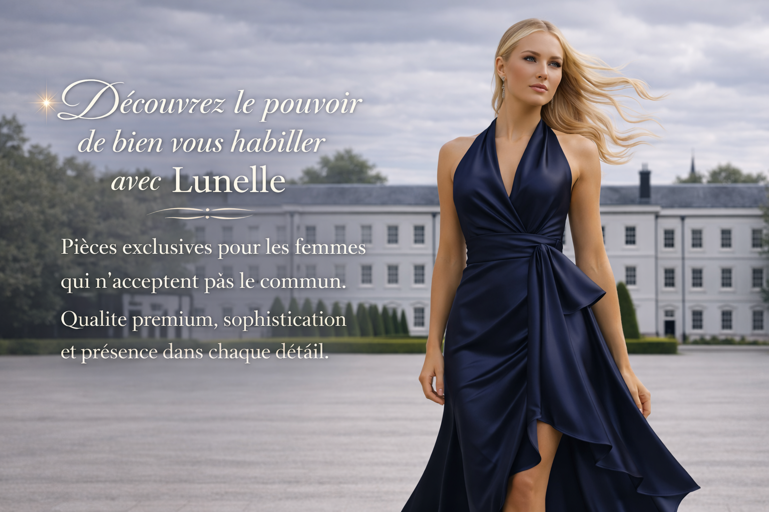 Robe de soirée en satin bleu nuit à col halter avec volants élégants