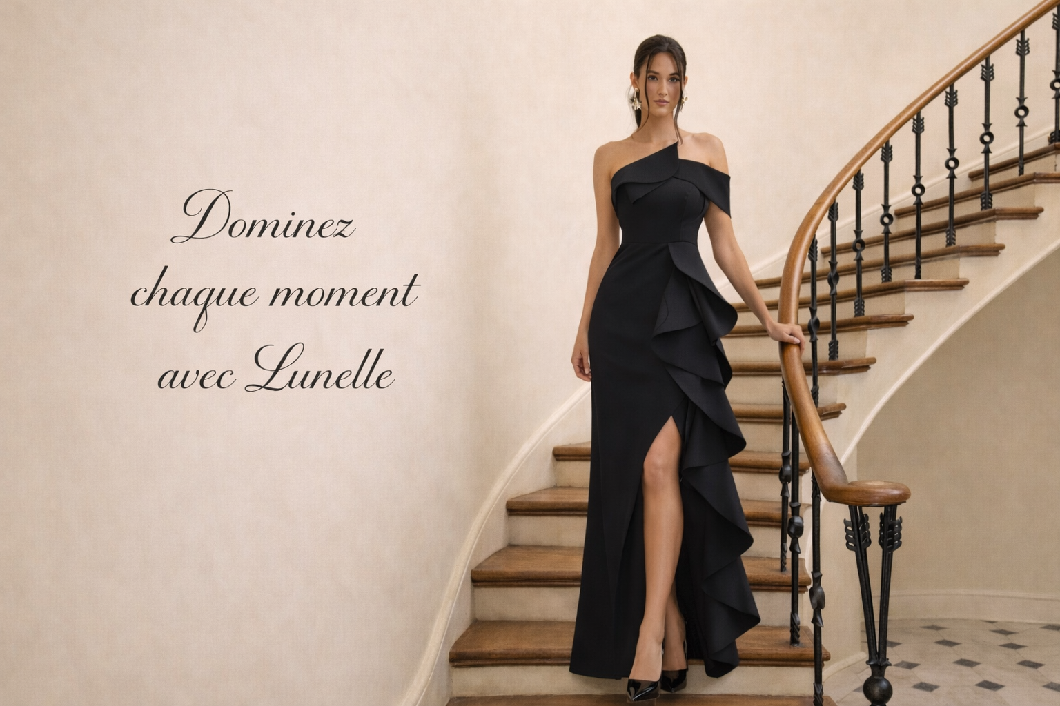 Robe longue en satin drapé bleu nuit avec détails à volants