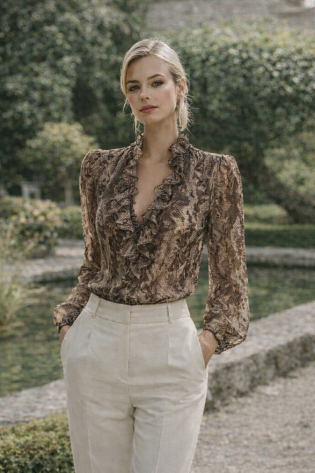 Blouse en chiffon à col en V avec dentelle et fermeture boutonnée